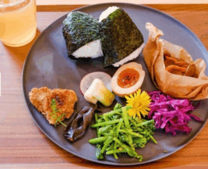 - 人気のランチ付き:Wacca農園や黒川で採れた旬野菜とハーブのお惣菜、お好きなおにぎり2つ、ドリンクが付いた日替わりランチプレート。